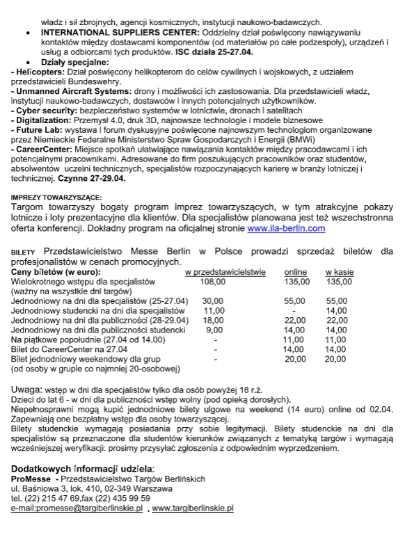 Informacje na temat możliwości zakupu biletów na ILA 2018 przez firmę ProMessa - Przedstawicielstwo Targów Berlińskich.