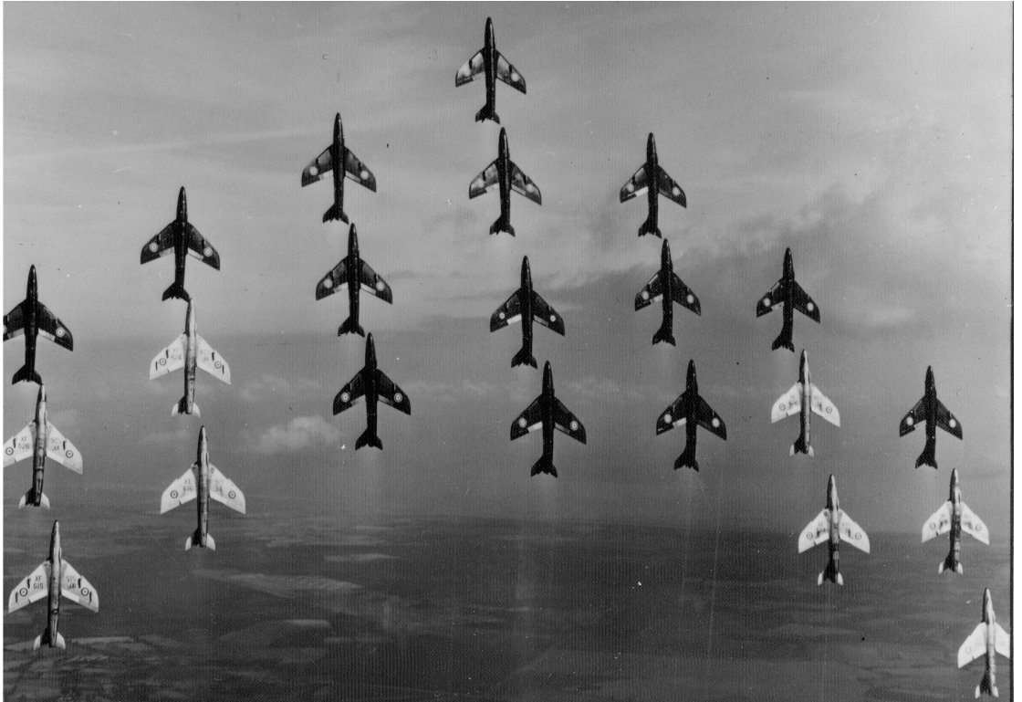 Zespół Black Arrows latający w latach '50 na Hawker Hunterach. W 1958 roku na pokazach w Farnborough zaprezentowali się w formacji złożonej z 22 statków powietrznych, przy okazji pobili rekord ilości samolotów wykonujących pętlę.