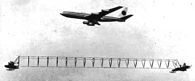 Pora na zamkniecie, tym najdłuższym samolotem jest nie oblatana konstrukcja ale warta wspomnienia. W latach sześćdziesiątych zakiełkował pomysł na skonstruowanie samolotu reklamowego składającego się z dwóch samolotów połączonych podłużną kratownicą na której lampy wyświetlane sekwencyjnie pozwalały wyświetlać ruchome napisy. Projekt nazwał się Slingsny CAMCO i składał się z dwóch amfibii, przedniej z dwoma silnikami o mocy po 375 kM i tylnej amfibii z silnikiem o mocy 100 kM Rozpiętość samolotu to 21,2 m a długość całkowita 115 m, Na papierze powstało kilka wersji cywilnych i wojskowych ale pierwszy prototyp V1 (cywilny) spłonął w pożarze zakładów w 1969 roku po czym zakłady popadły w kłopoty finansowe po czym skreślono z realizacji wszelkie projekty nie generujące zyski. Sytuacja nie uległa poprawie i wkrótce zakłady splajtowały kończąc wiele projektów w tym projekt CAMCO. Przyszły samolot miał wygladać tak jak na zdjęciach